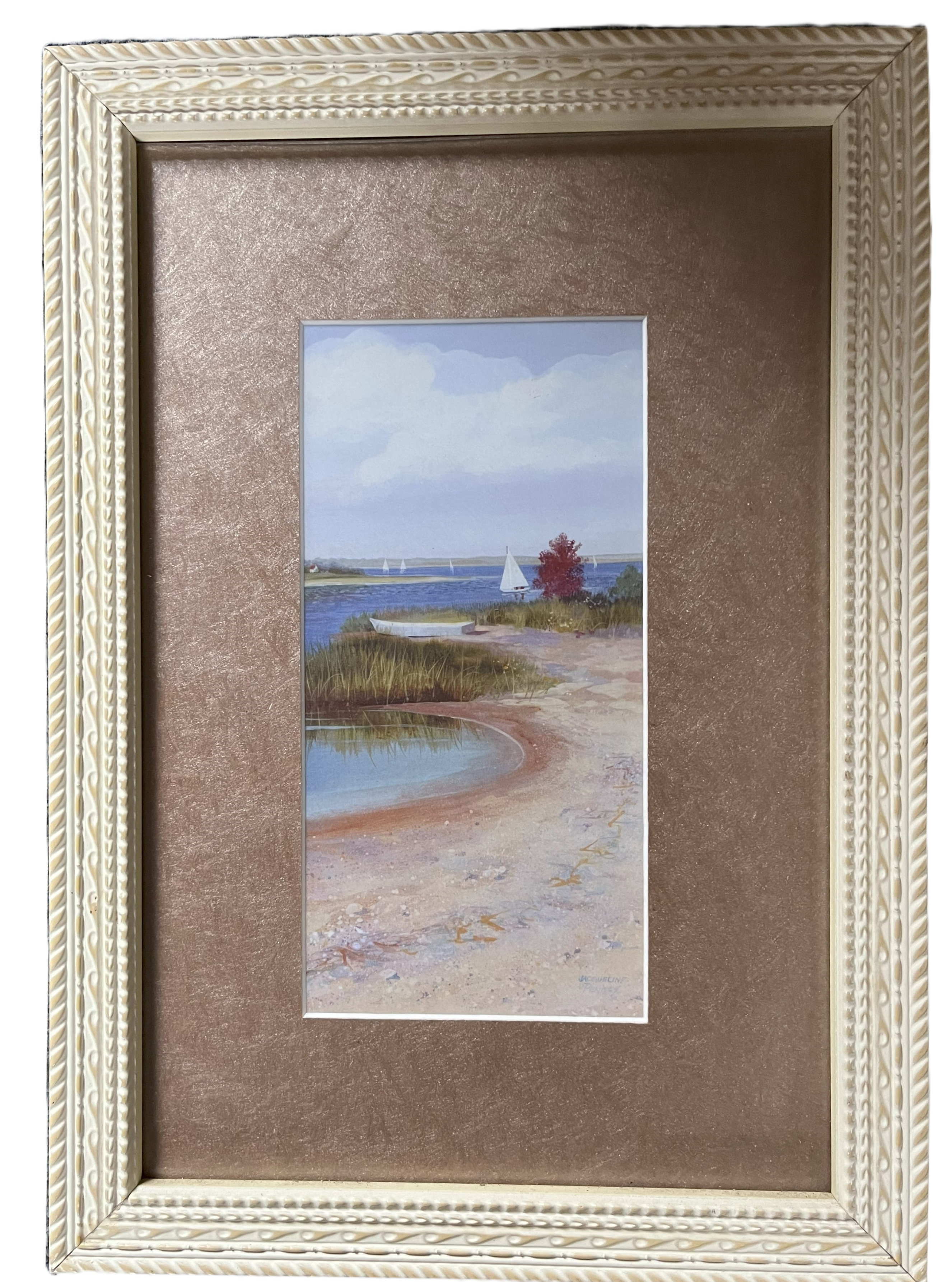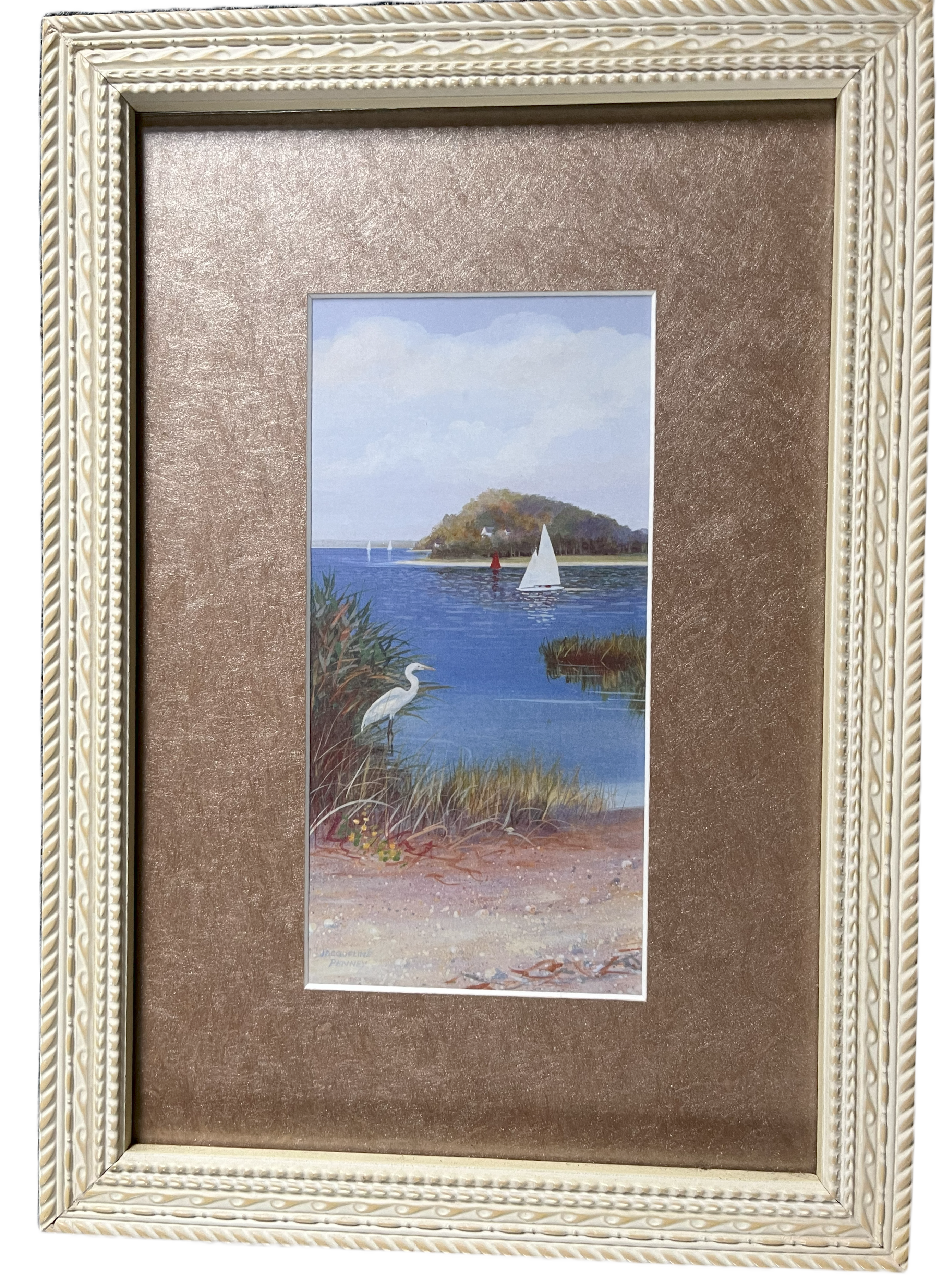 Framed in an Off white Standford White style moulding. Brushed soft gold mats, UV Conservation Non Reflective Glass